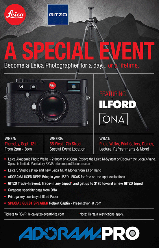 Adorama has organized a wide range of Leica events on Thursday, September 12 including a lecture by New York Times photographer Robert Caplin. For more information and registration visit this link.