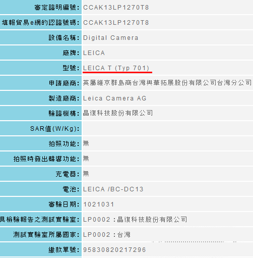 The Taiwanese NCC government agency has a filing for a new Leica T Type 701 camera. My guess is that this will be a super-zoom compact camera (T for tele?) based on a Panasonic model (maybe a direct replacement of the V-Lux 4 camera).