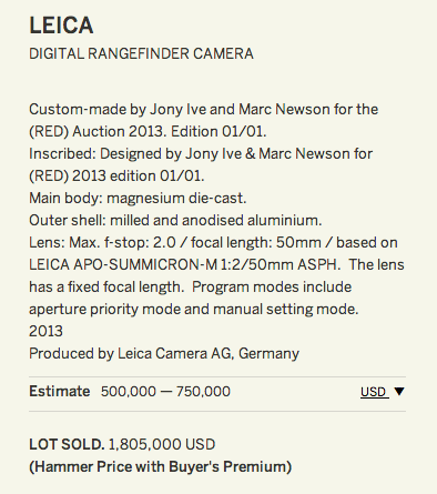 The Leica M custom made camera by Jony Ive and Marc Newson for (RED) sold for $1,805,000 at Sotheby’s charity auction in New York (hammer price with buyer’s premium). The camera was initially expected to reach $500,000 to $750,000. The (RED) auction at Sotheby’s raised a total of $26.2 million to fight AIDS in Africa.