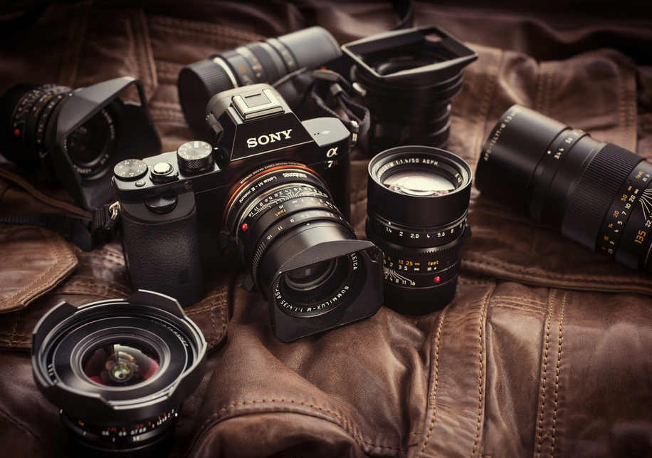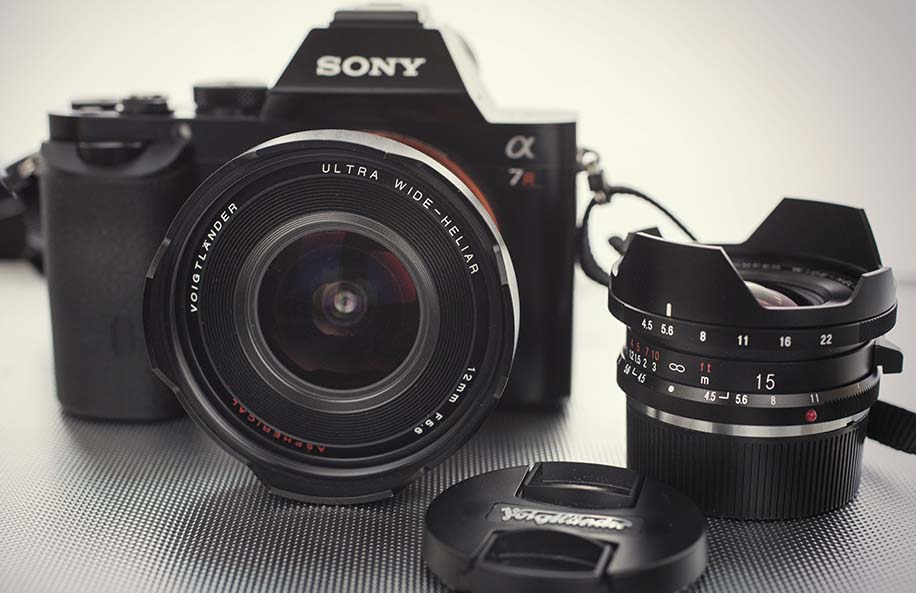 The photo above shows a Sony A7r camera with 36.4MP sensor mounted with a Leitz 35mm Summilux lens. Around it are some of the lenses used for testing in this article, including a 21mm Elmarit, 90mm Elmarit, 28mm Summicron, 50mm Summilux, 135mm APO-Telyt-M, and two Voigtlander super wide lenses, the 12mm (shown above) and 15mm.