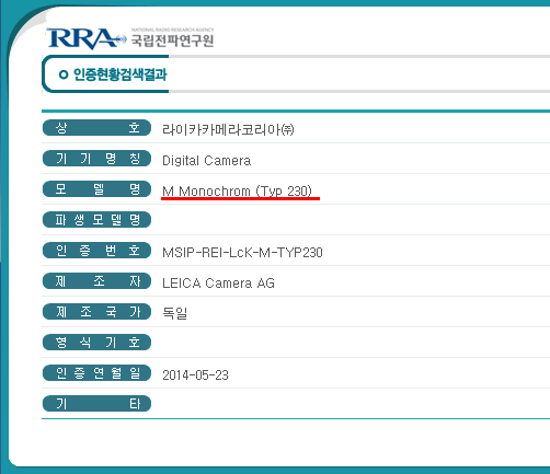 Leica registered a new camera called M Monochrom Typ 230 with the radio government agency of Korea RRA (Korea Radio Research Laboratory). This means that the new Monochrom camera will have built-in Wi-Fi capabilities and will be announced at Photokina (September).