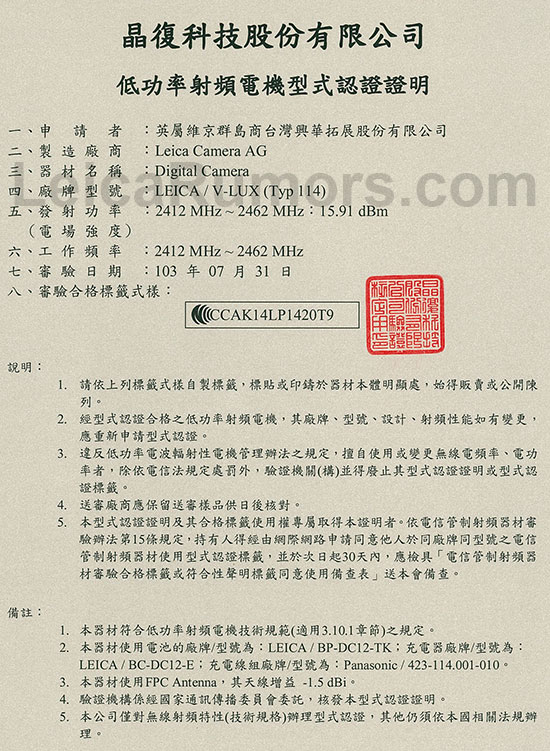 A new Leica V-Lux Typ 114 camera was registered also on a Taiwan’s NCC government site. The same camera model was listed on the Indonesian Communication Agency website a month ago. The official announcement should be at Photokina.