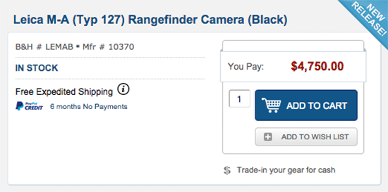 The Leica M-A (Typ 127) film camera is now shipping in the US and is currently in stock at B&H, Adorama and Amazon (you can also take an additional $25 off at Amazon with this offer). The M-A is the latest film rangefinder introduced by Leica at Photokina – it doesn’t have a light meter and is fully mechanical (if does not need batteries to operate).