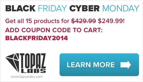 For Black Friday and Cyber Monday TopazLabs are offering their entire Photography Collection (all 15 products) for $249.99 (reg $429.99) with coupon code BLACKFRIDAY2014. For more information, click here. This offer will end on December 1st.