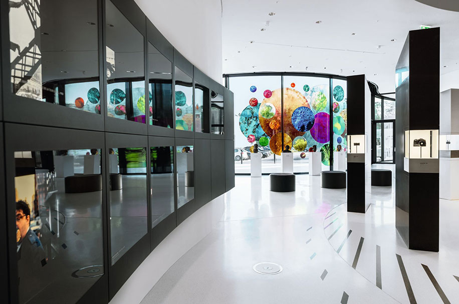 The production areas offer public viewing and are located immediately adjacent to the product and exhibition areas. Three panoramic windows allow visitors to see what goes on in the clean rooms of Leica manufacturing, where lens elements, complete lenses and cameras are made. Individual windows are equipped with interactive touchscreens to provide more information about the processes. Like with a smartphone, visitors can tap on and swipe over the screens to access films, photos and explanations.