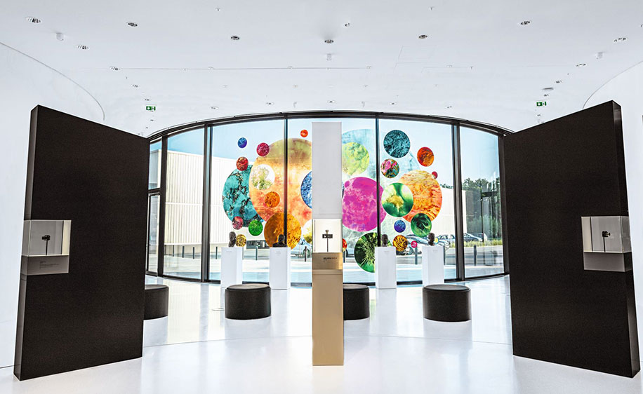 The production areas offer public viewing and are located immediately adjacent to the product and exhibition areas. Three panoramic windows allow visitors to see what goes on in the clean rooms of Leica manufacturing, where lens elements, complete lenses and cameras are made. Individual windows are equipped with interactive touchscreens to provide more information about the processes. Like with a smartphone, visitors can tap on and swipe over the screens to access films, photos and explanations.