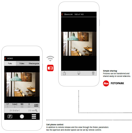 - A WiFi module for wireless transfer of still pictures and video to other devices. The app also allows you to remotely control settings such as aperture and shutter speed from your smart phone or tablet. The free Leica Q app to access these features is available on both the App Store and Google Play Store for iOS and Android.