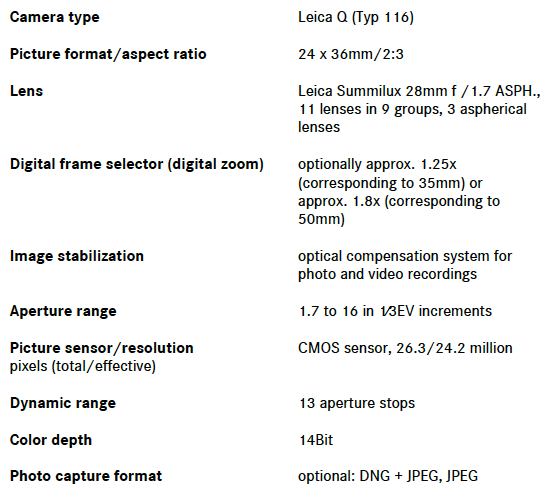 “We’re very proud to offer the world’s first camera that combines the quality and functionality of our iconic M models, along with the convenience and speed of a super high end compact camera,” said German Product Manager, Peter Kruschewski. “The new Leica Q carries the rich traditions of Leica cameras forward with the high quality features you come to expect from Leica, while also keeping the future in mind by integrating social sharing and cutting-edge specifications. It really is a true Leica, while being an industry trailblazer at the same time.”