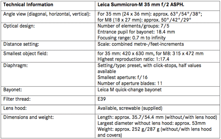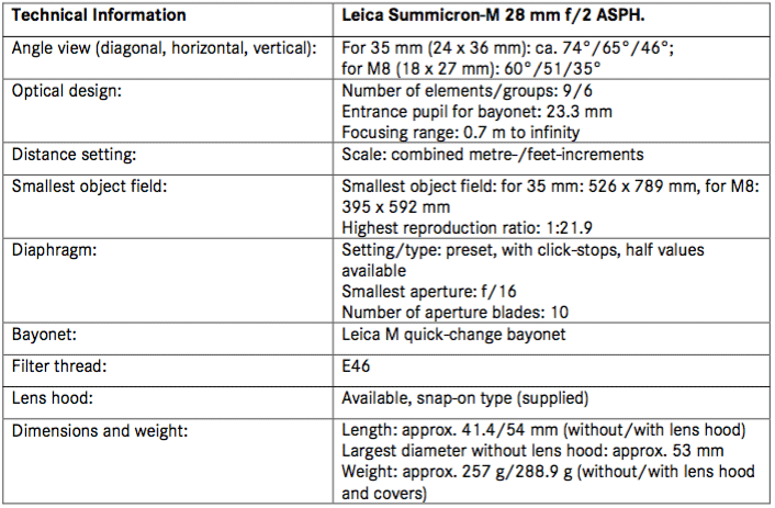 Update: the lens hood of the 28mm f/2 is wrongly described as “snap-on” in the above table I got from Leica Camera. This is a mistake, the lens hood is “screw-on”.