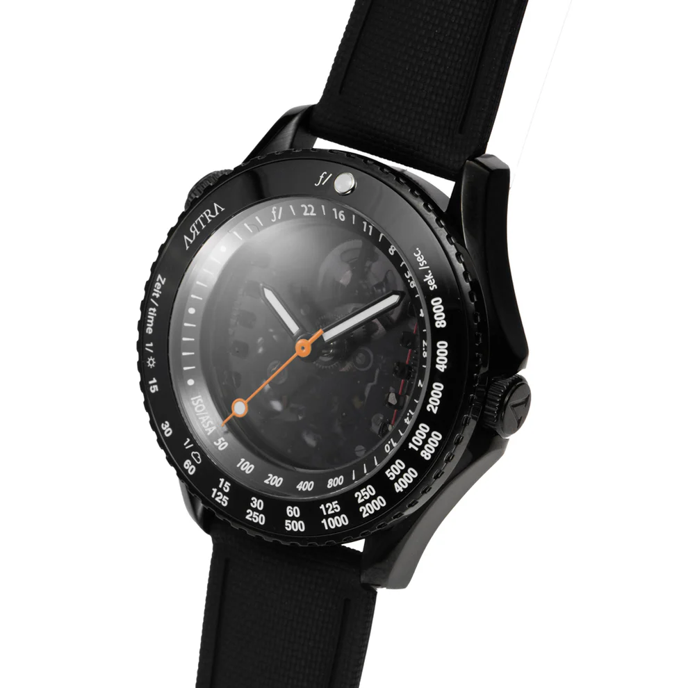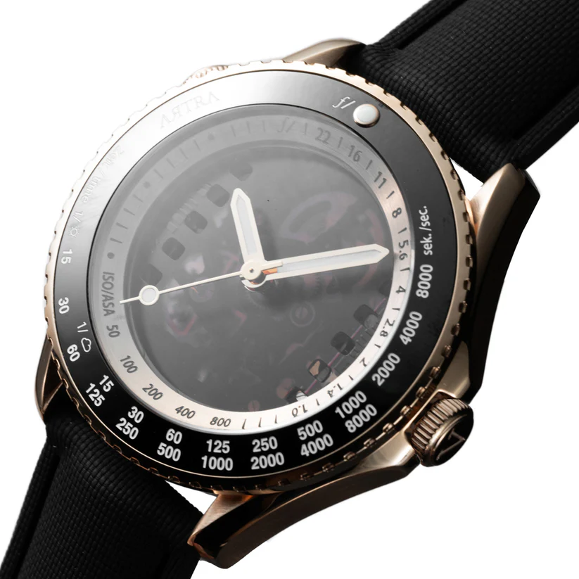 Artra Designs’ “Camera One” collection is a series of limited-edition mechanical watches rendered in premium materials with hand-finished movements visible through sapphire casebacks that pay homage to the golden age of photography, drawing inspiration from iconic cameras and lenses dating back to 1878. Each timepiece features dials and details crafted to resemble camera apertures, shutter blades, depth-of-field scales, and film advance mechanisms. The new Camera One limited edition watch comes in five different configurations (two of them are sold out already):
