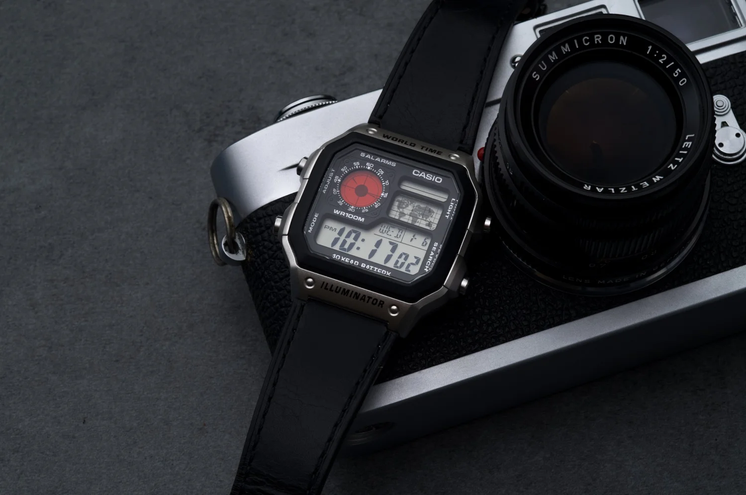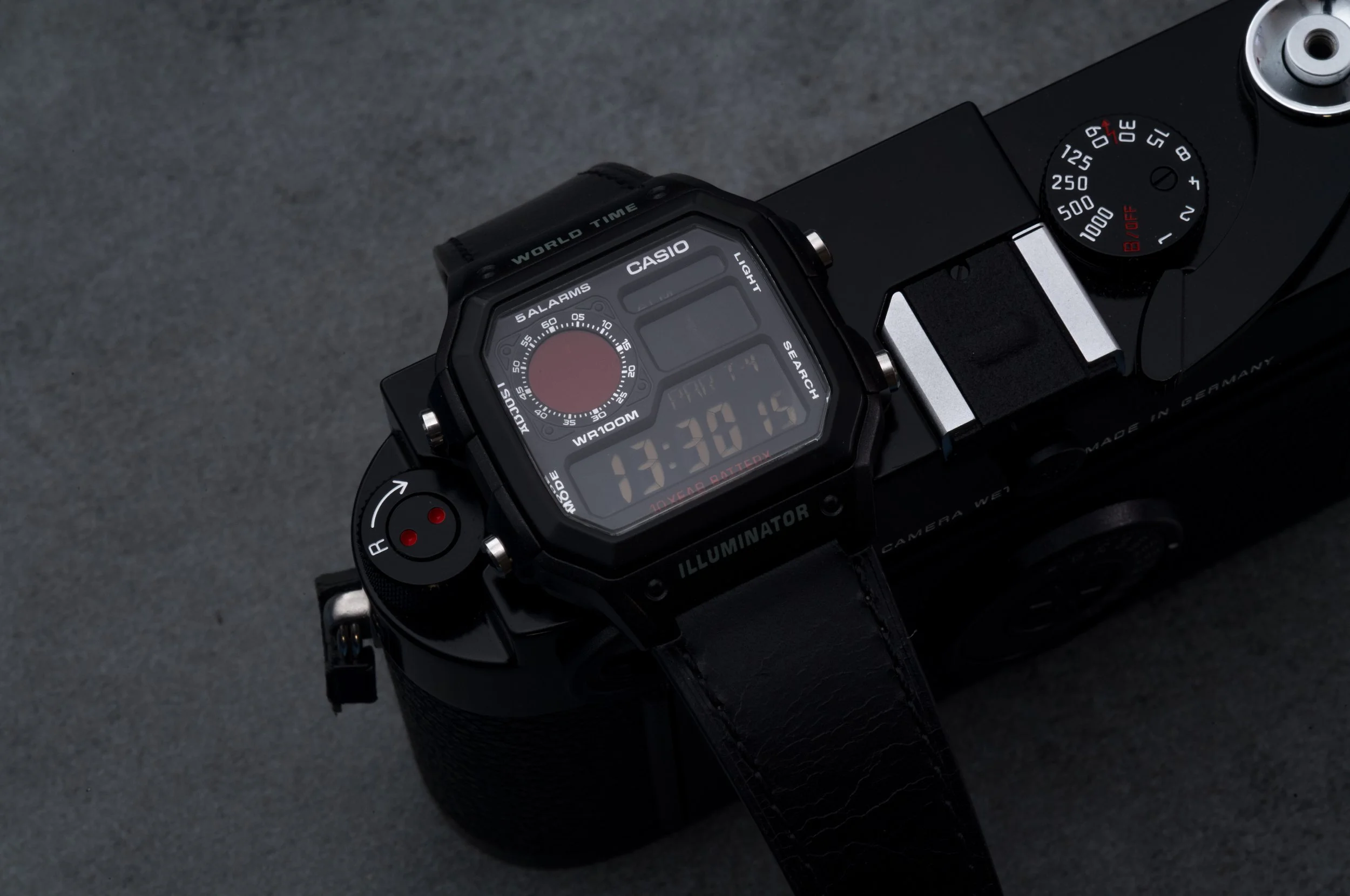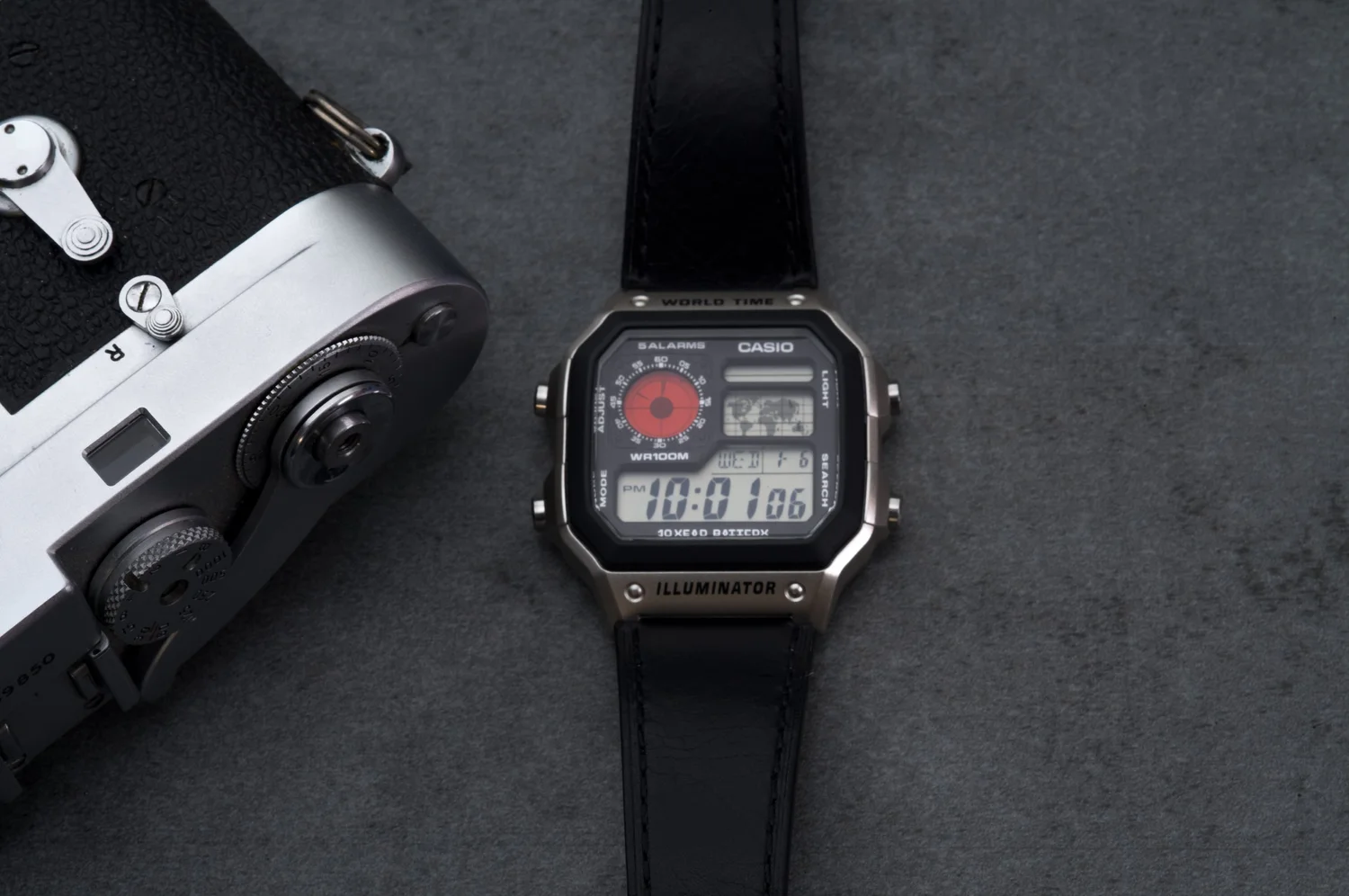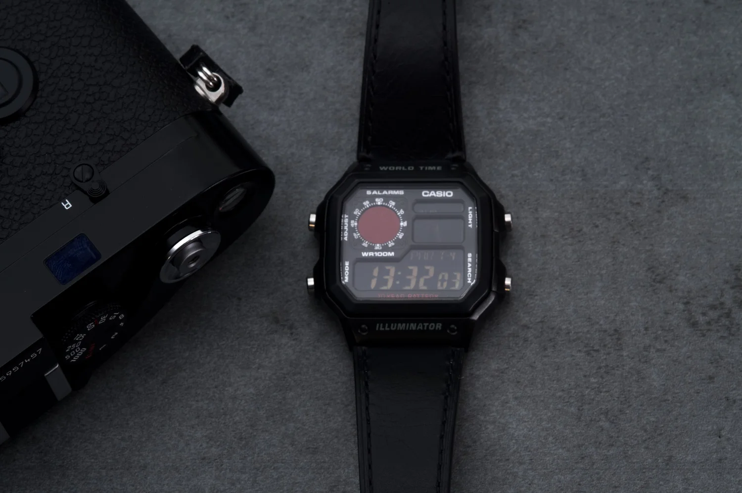 - Completing the look with a leather watch strap, mirroring the leatherette of the cameras
