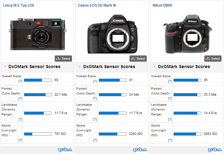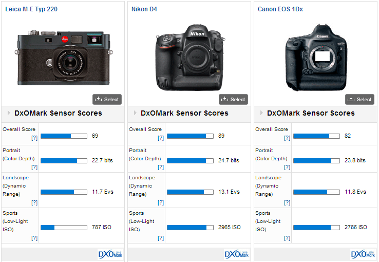 In fact, with a DxOMark Overall Score of 68, or 69 for the Leica M9, M9-P and ME Type 220, these cameras offer the worst image quality DxOMark have tested on a full frame sensor, with the exception of the 10-year-old Canon EOS 1Ds.