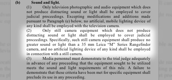 The Leica M rangefinder camera still sets the standard of acceptable shutter noise in many US courtrooms today. Here is a quote from Minnesota court’s General Rules of Practice document: