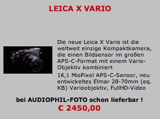 The German retailer Audiophilfoto has a listing for the Leica X Vario camera on their front page. The specifications are the same as previously reported. The price is €2450 (the US price will be lower, probably around $2,850). The camera will be officially announced tomorrow and should be available in Leica stores.