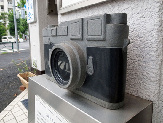 Stone Leica M3 sculpture outside of Arrow Camera in Yotsuya, Tokyo.