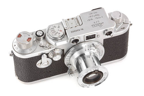 This famous camera, the ‘One Millionth Leica’, was presented to Dr. Ludwig Leitz by Willi Stein, the ‘Father’ of the Leica M3, in fine original condition, with matching and mint CF Summicron 2/50mm, ex. Leitz Museum (with original yellow museum sticker ‘M 964’ on base plate), ex Surat Collection – the camera is listed as one of the few official presentation cameras, no. 1.000.001 was given to Alfred Eisenstaedt.