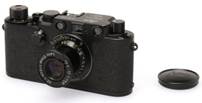 234IIIf Black Paint“Swedish Military” Serial no.822990, 1956This IIIf was specially made for the Swedish national army in 1956. It can withstand very extreme weather conditions in Sweden and only 100 units were produced. The camera and lens are original, complete with matching black paint Elmar 3.5/5cm (#1427190) and early A36 Black Paint lens cap, in new condition, very rare. This camera has been authenticated by Lars Netopil.$600,000