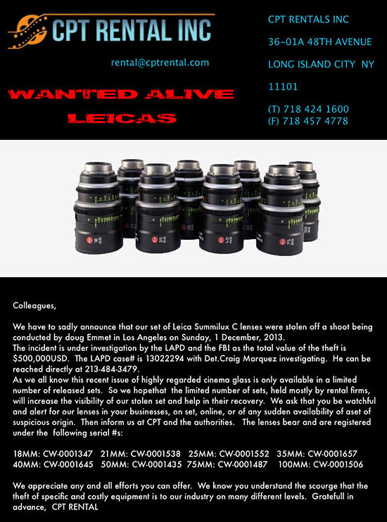 $500,000 worth of Leica Summilux C cinema lenses were stolen from a movie set in Los Angeles. Here are the lens serial numbers: