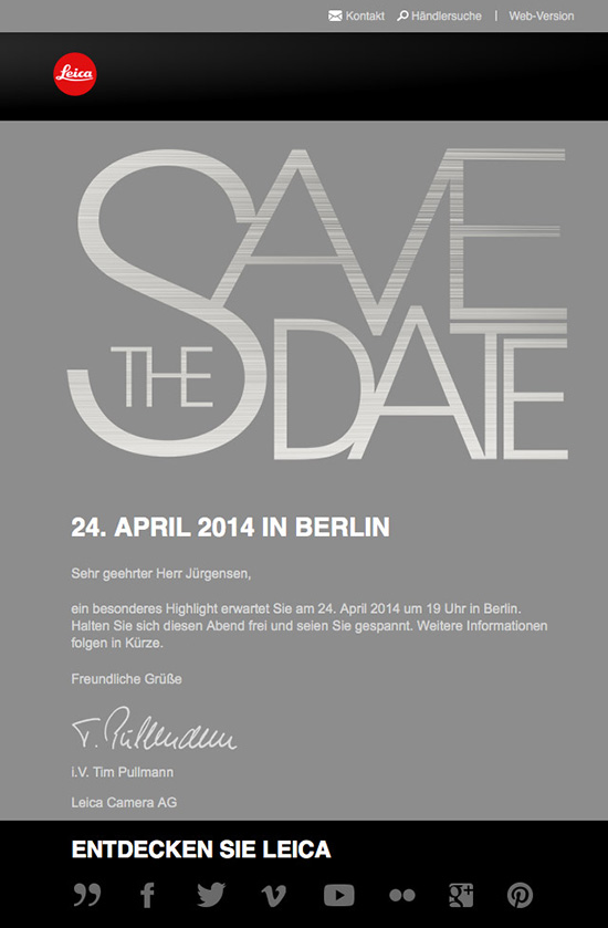 Leica sent out invitations for a “special highlight” event on April 24th. If you are a LeicaRumors reader, this should not be a surprise because few months ago I already reported that the long awaited Leica T type 701 mirrorless camera will be announced in April. The new camera is expected to have an APS-C sensor and will mostly likely be produced in Germany, while some of the lenses could be made in Asia.
