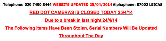 One of our sponsors Red Dot Cameras had a break-in last night. Here is the list and serial numbers of the stoled Leica gear:
