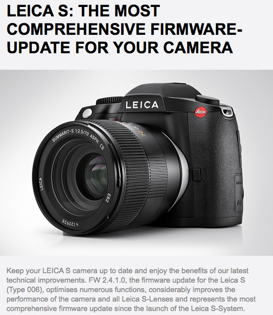 A new firmware update version 2.4.1.0 for the Leica S Type 006 medium format camera is now available for download.