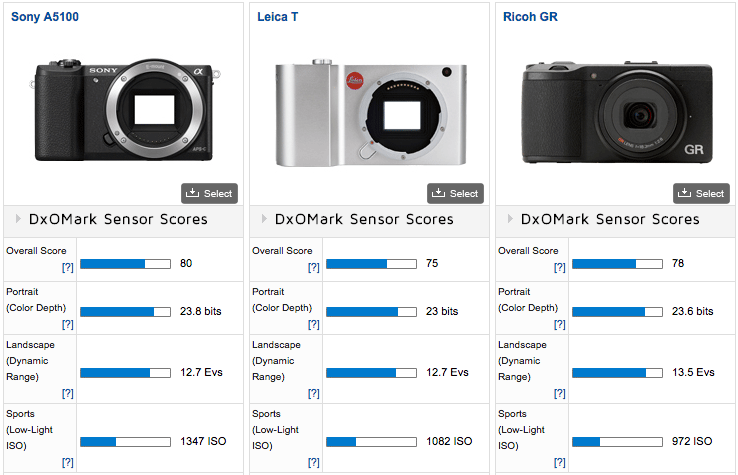 “With an overall DxOMark Sensor Score of 75, the Leica T ranks 71st on the DxOMark database for all camera sensors and 32nd for all cameras featuring an APS-C-sized sensor. Closer analysis of the three sub-scores indicates that Dynamic Range and ISO are slightly stronger aspects of sensor performance. A Dynamic Range score of 12.7 EVs and Low Light ISO score of 1082 come in at 63rd and 57th place, respectively, whereas a slightly weaker result of 23 bits for Color Depth impacts the Leica T’s overall performance.”