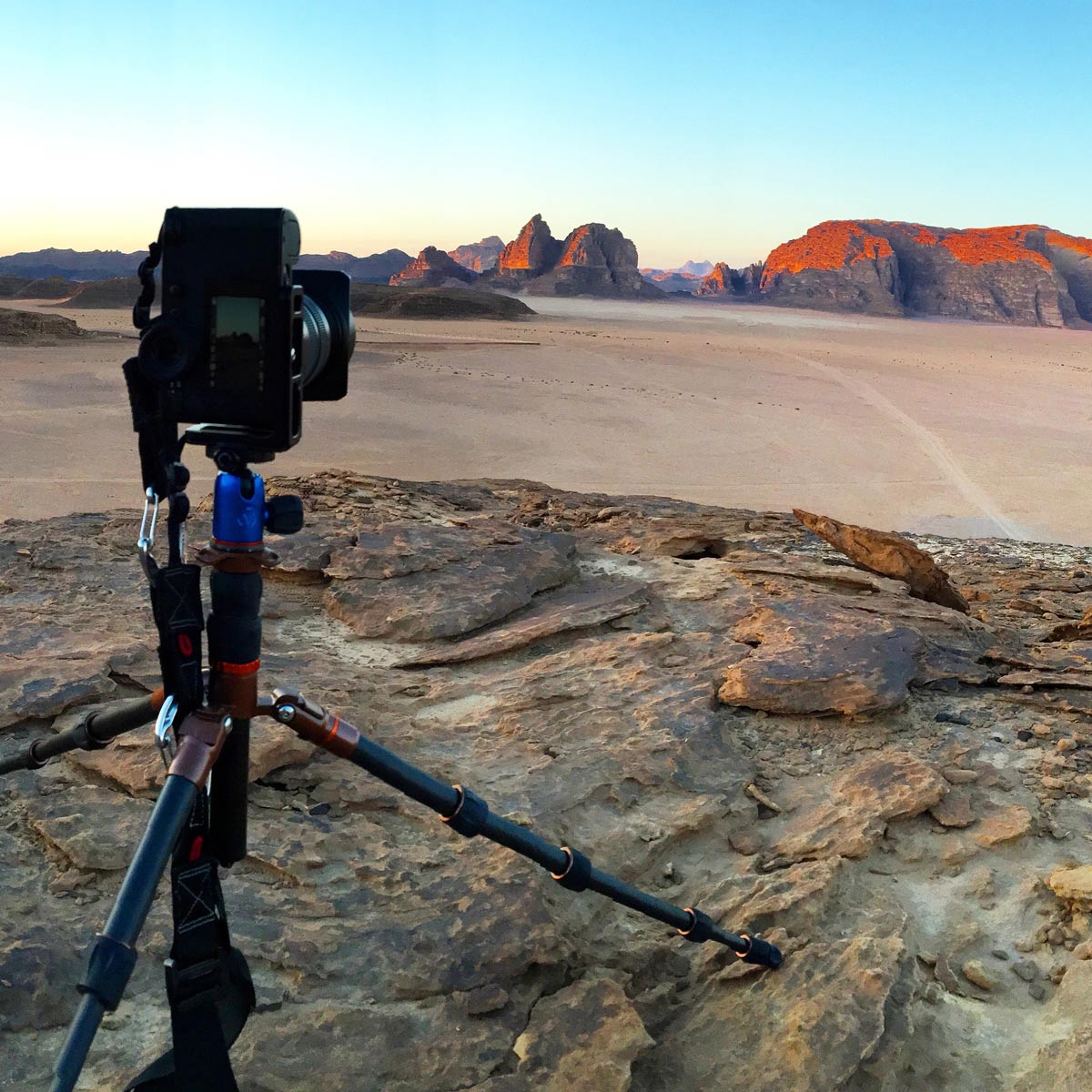 The Leica SL with the Leica 24-90mm lens on a 3 Legged Things tripod in Jordan. This setup was for a panorama shot of the sun setting over the Wadi Rum desert.