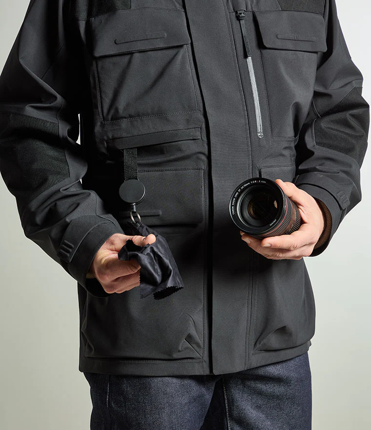 The jacket’s design and fit afford a wide range of movement and offer carefully considered features to assist the in-field photographer. The wide array of pockets include an insulated battery pocket to prolong battery life in the cold. Voluminous cargo pockets have double folds for added security and protection. There’s even a branded lens-cloth on a retracting lanyard in its own compartment.