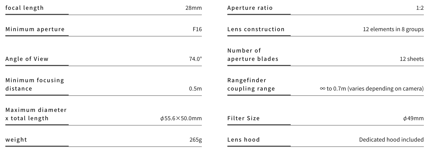 Optimized for full-size M mount sensors, the apochromatic design thoroughly eliminates various aberrations, including axial chromatic aberration, while also pursuing ultimate performance in terms of resolution and contrast reproduction (see attached MTF chart). The lens is made up of 12 elements in 8 groups, and includes 6 pieces of anomalous partial dispersion glass and 2 double-sided aspherical lenses, boasting performance that completely changes the value of a large-aperture wide-angle lens such as 28mm F2.