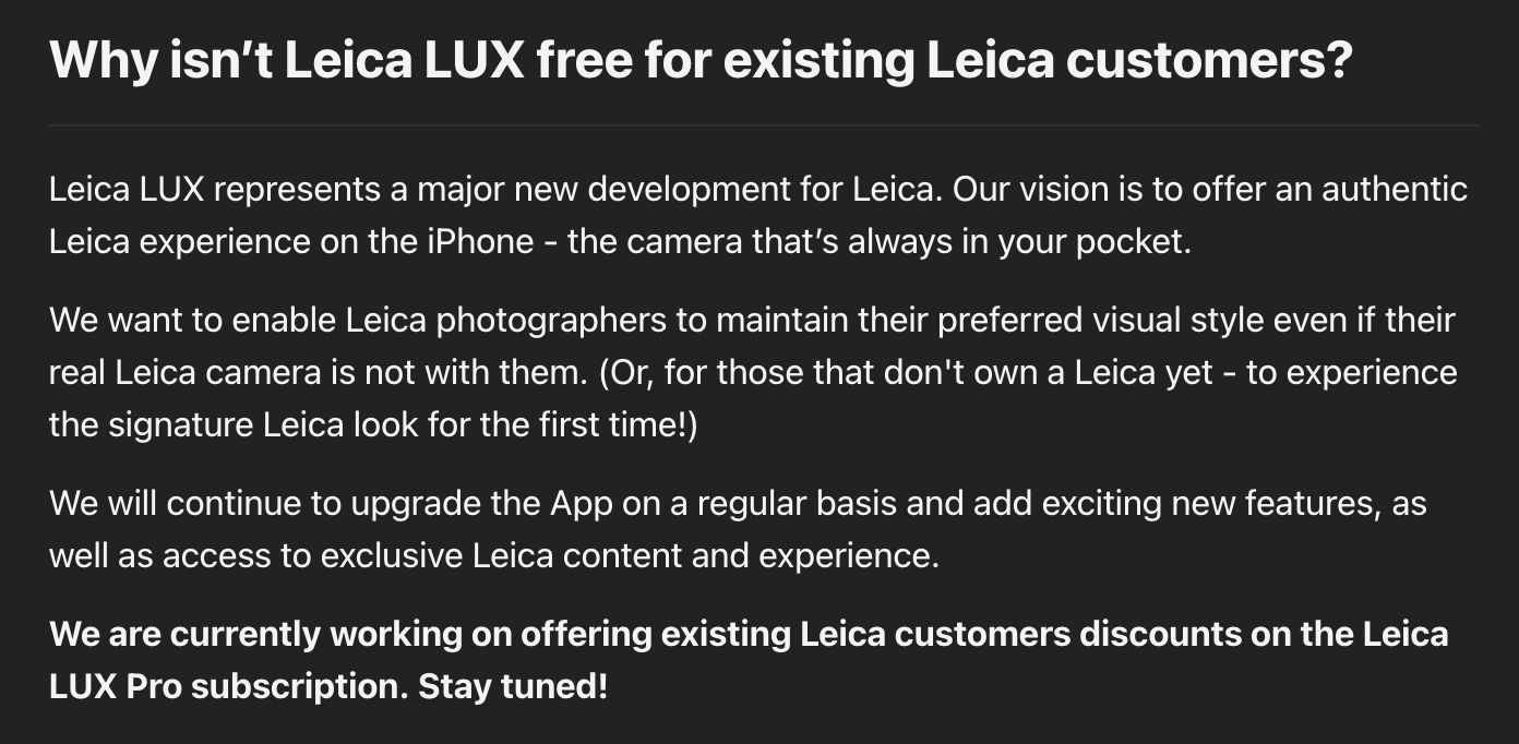 → Leica is currently working on offering existing Leica customers discounts on the Leica LUX Pro subscription.
