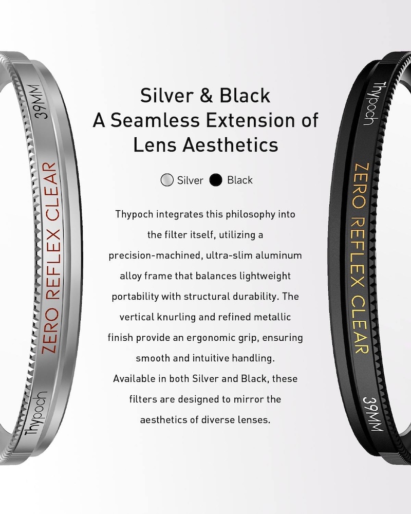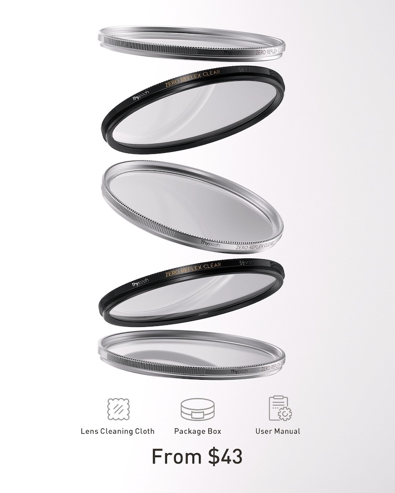 → The previously reported new Thypoch Zero Reflex filters are now officially announced, featuring 0.01% ultra-low reflectivity with 1/4- and 1/2-strength, and available in 39mm | 49mm | 52mm | 58mm | 62mm | 67mm | 72mm | 77mm sizes. Pre-orders are now open at B&H Photo and the Thypoch store (additional information).