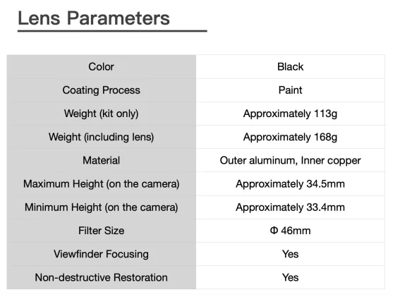 • Features a lightweight aluminum exterior paired with a brass inner structure, offering both durability and smooth operation while significantly reducing overall weight.Perfect for street and documentary photography, giving you a more effortless shooting experience.