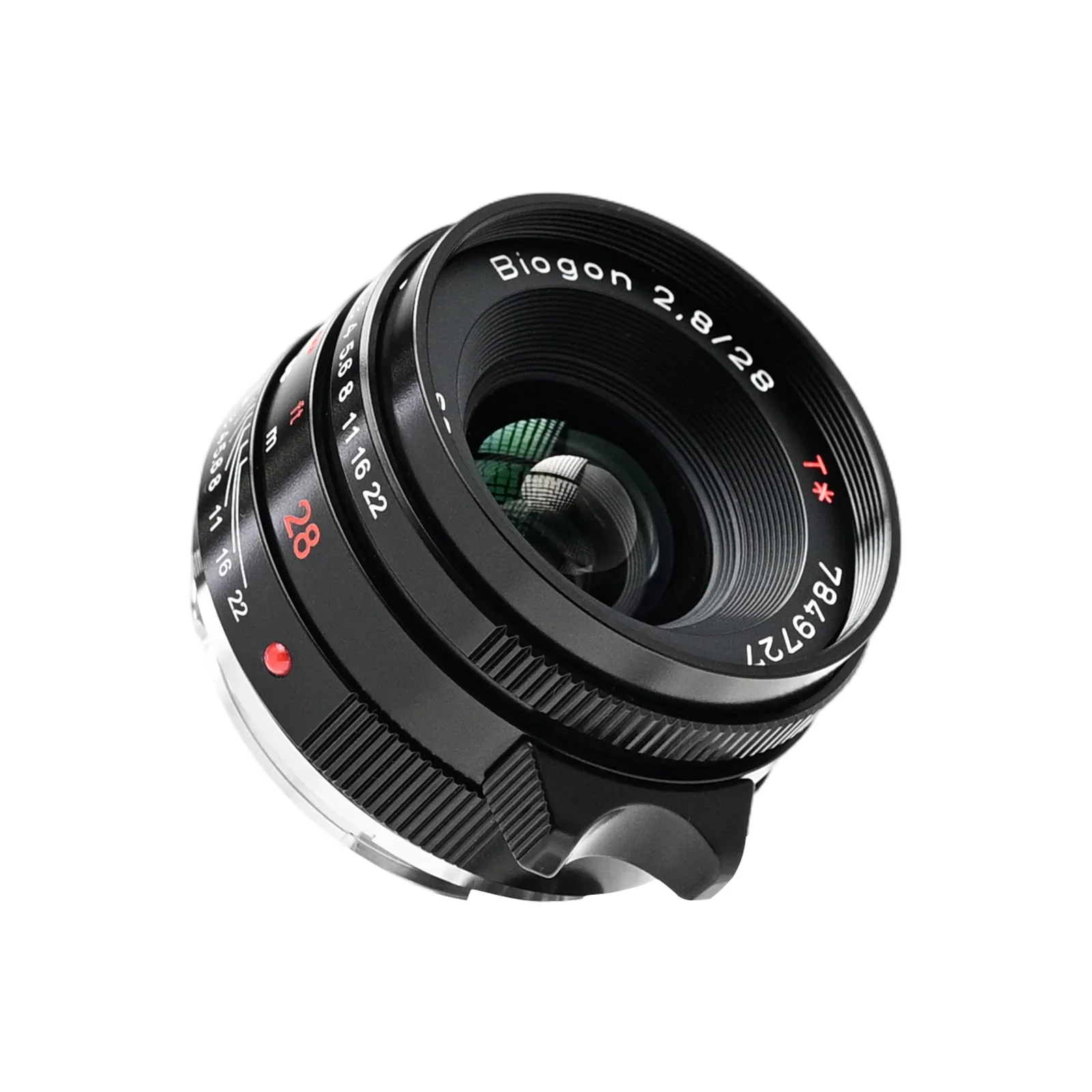 The G28 features a Biogon symmetrical optical design with 7 elements in 5 groups, providing a 75° wide-angle field of view. With a maximum aperture of f/2.8, minimum aperture of f/22, closest focusing distance of 0.5m, 46mm filter thread, and weighing just 150g, this lens exemplifies compact precision.
